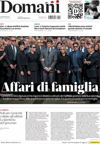 Domani: apertura con titolo "Affari di famiglia". La morte di Silvio Berlusconi ha riaperto il dibattito sul ruolo dei figli nella gestione delle sue aziende. In Italia la maggioranza delle grandi imprese sono famigliari. E le guerre tra eredi sono la normalità