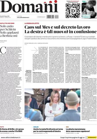 Domani: apertura con titolo "Caos sul Mes e sul decreto lavoro. La destra è (di nuovo) in confusione". Forza Italia è allo sbando e manda sotto il governo sul lavoro. La Russa: "I senatori? Erano a un cocktail"