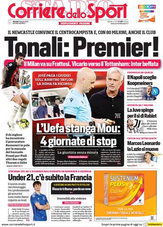 Corriere dello Sport: apertura con titolo "Tonali: Premier!". Il Newcastle convince il centrocampista e, con 80 milioni, anche il club. Spazio a "L'Uefa stanga Mou: 4 giornate di stop"