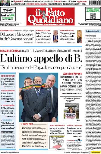Il Fatto Quotidiano: apertura con titolo "L'ultimo appello di B.". Russia e Ucraina: il leader lo stava preparando, ma non ha potuto lanciarlo