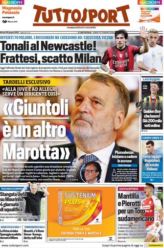 Tuttosport: apertura con titolo "Giuntoli è un altro Marotta". Intervista esclusiva a Tardelli. Spazio a "Tonali al Newcastle! Frattesi, scatto Milan"