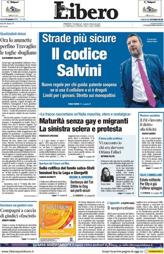 Libero: apertura con titolo "Il codice Salvini". Nuove regole per chi guida: patente sospesa se si usa il cellulare o si è drogati. Limiti per i giovani. Stretta sui monopattini