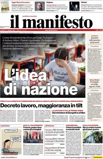Il Manifesto: apertura con titolo "L'idea di nazione". L'esame di maturità torna all'era pre Covid. Tra le prove di italiano Fallaci, Chabod e Quasimodo. Che Sangiuliano e Calderoli traducono in federalismo, sovranismo e una certa idea di Paese. La traccia sull'ex ministro Bianchi crea l'incidente diplomatico