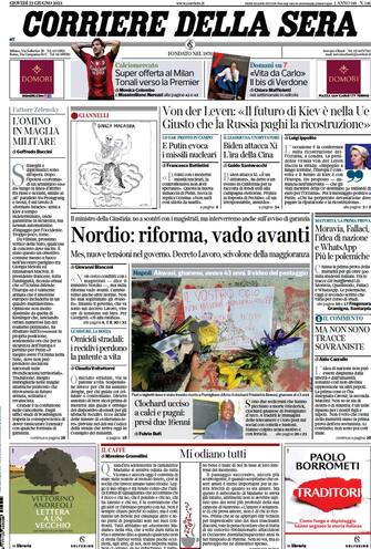 Corriere della Sera: apertura con titolo "Nordio: riforma, vado avanti". Mes, nuove tensioni nel governo. Decreto Lavoro, scivolone della maggioranza. Spazio a "Clochard ucciso a calci e pugni, presi due 16enni"