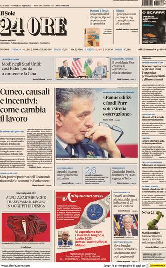 Il Sole 24 Ore: apertura con titolo "Cuneo, causali e incentivi: come cambia il lavoro". Spazio a "Bonus edilizi e fondi Pnrr sotto stretta osservazione"