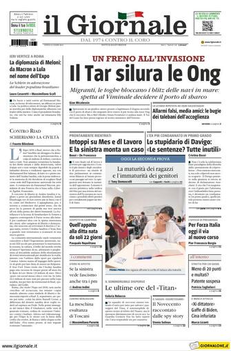 Il Giornale: apertura con titolo "Il Tar silura le Ong". Migranti, le toghe bloccano il blitz delle navi in mare: spetta al Viminale decidere il porto di sbarco