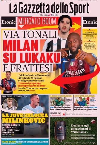 La Gazzetta dello Sport: apertura con titolo "Via Tonali, Milan su Lukaku e Frattesi". L'idolo milanista al Newcastle. Cifre choc: 70 milioni e 48 al giocatore in sei anni. I rossoneri preparano un doppio sgarbo all'Inter. E anche Thuram è a un passo