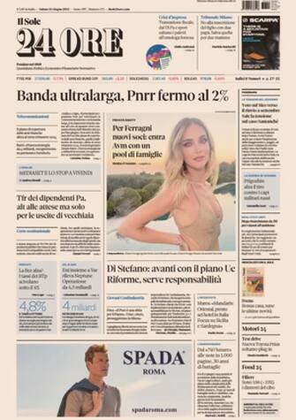 "Banda ultralarga, Pnrr fermo al 2%" è l'apertura del Sole 24 ore. Al centro "Per Ferragni nuovi soci, entra Avm con un pool di famiglie"