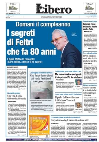 In apertura per Libero gli 80 anni di Feltri: "I segreti di Feltri che fa 80 anni. Il figlio Mattia lo racconta: 'Caro babbo, adesso di ho capito"