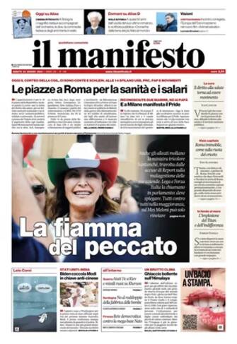 "La fiamma del peccato" è il titolo de il manifesto sulla vicenda giudiziaria che ha coinvolto Santanchè. Spazio anche al corteo della Cgil: "Le piazze a Roma per la sanità e i salari"