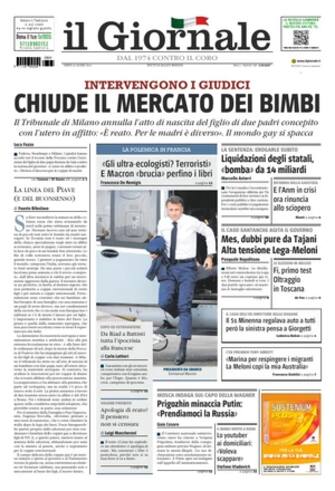 Il Giornale apre con "Chiude il mercato dei bimbi". "Il Tribunale di Milano annulla l'atto di nascista del figlio di due padri concepito con l'utero in affitto"