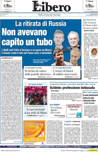 Libero: apertura con titolo "Non avevamo capito un tubo". La ritirata di Russia: i ribelli anti-Putin si fermano a un passo da Mosca. E intanto crolla il mito del Paese unito e invincibile