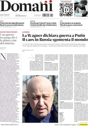 Domani: apertura con titolo "La Wagner dichiara guerra a Putin. Il caos in Russia sgomenta il mondo". Lo chef di Putin si ammutina e manda i suoi contro Mosca, ma si ferma prima di arrivare alla capitale