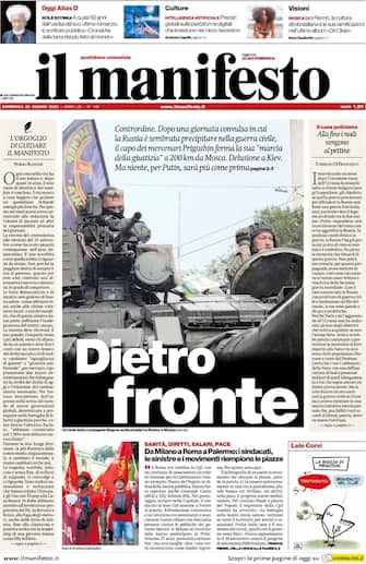 Il Manifesto: apertura con titolo "Dietro fronte". Contrordine. Dopo una giornata convulsa in cui la Russia è sembrata precipitare nella guerra civile, il capo dei mercenari Prigozhin ferma la sua marcia della giustizia a 200 chilometri da Mosca. Delusione a Kiev. Ma niente, per Putin, sarà più come prima