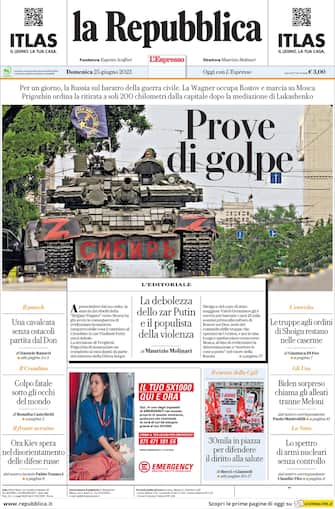 La Repubblica: apertura con titolo "Prove di golpe". Per un giorno, la Russia sul baratro della guerra civile. La Wagner occupa Rostov e marcia su Mosca. Prigozhin ordina la ritirata a soli 200 chilometri dalla capitale dopo la mediazione di Lukashenko
