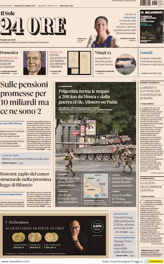 Il Sole 24 Ore: apertura con titolo "Sulle pensioni promesse per 10 miliardi ma ce ne sono 2". Spazio a "Prigozhin che ferma le truppe a 200 chiometri da Mosca e dalla guerra civile: mistero su Putin"