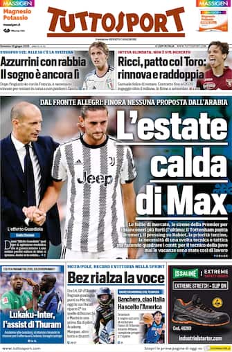 Tuttosport: apertura con titolo "L'estate calda di Max". Dal fronte Allegri: finora nessuna proposta dall'Arabia. Spazio a "Azzurrini con rabbia. Il sogno è ancora lì"