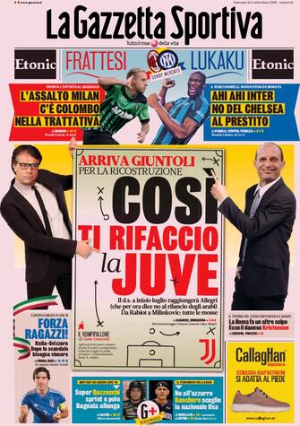 La Gazzetta dello Sport: apertura con titolo "Così ti rifaccio la Juve". Arriva Giuntoli per la ricostruzione. Spazio a "Frattesi: l'assalto Milan. C'è Colombo nella trattativa". E: "Ahi, ahi Inter No del Chelsea al prestito"