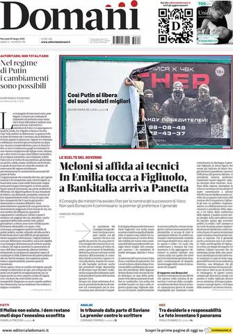 Domani dedica la prima pagina ai due temi di giornata: la situazione in Russia dopo il tentato colpo di stato dei giorni scorsi e la nomina di Figliuolo come commissario per l'alluvione in Emilia Romagna e quella di Panetta a Bankitalia