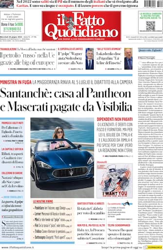Il Fatto Quotidiano apre il giornale con il caso di Daniela Santanchè “casa al Pantheon e Maserati pagate da Visibilia”. In alto le conseguenze del tentato golpe in Russia