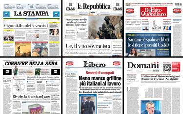 Tra le notizie sulle prime pagine dei quotidiani di oggi, lo scontro a Bruxelles sul piano Ue per i migranti, con il veto di Polonia e Ungheria. Ampio spazio anche alle rivolte in Francia scoppiate in tutto il Paese dopo l'omicidio di un 17enne da parte di un agente di polizia