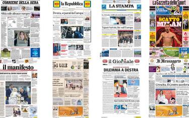 Aperture dei quotidiani dedicate allo scontro tra Tajani, coordinatore di FI, e Salvini, leader della Lega. Il primo dice: "Mai con Le Pen". Il secondo replica: "Mai con i socialisti, nessun veto sui miei alleati". Sui giornali sportivi le manovre di Juventus, Inter e Milan