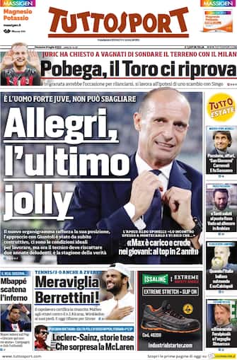 Tuttosport: apertura con titolo "Allegri, l'ultimo jolly". E' l'uomo forte, non può sbagliare. Spazio a "Pobega, il Toro ci riprova"