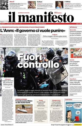 Il Manifesto: apertura con titolo "Fuori controllo". La polizia francese non rinuncia al metodo Floyd. La marcia pacifica in memoria di Adama Traoré e delle vittime delle forze dell'ordine scatena gli agenti che arrestano violentemente i manifestanti