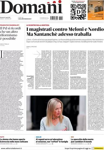 Domani: apertura con titolo "I magistrati contro Meloni e Nordio. Ma Santanché adesso traballa". L'Anm: "Contro di noi accuse pesantissime. La riforma della giustizia sembra una punizione. Non taceremo"