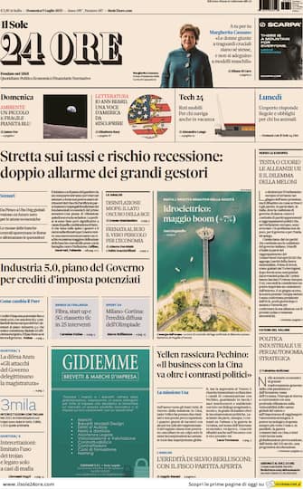 Il Sole 24 Ore: apertura con titolo "Stretta sui tassi e rischio recessione: doppio allarme dei grandi gestori". Spazio a "Industria 5.0, piano del Governo per crediti d'imposta potenziali"