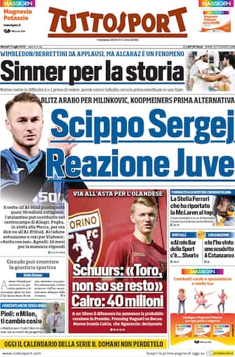 Tuttosport: apertura con titolo "Scippo Sergej, reazione Juve". Blitz arabo per Milinkovic, Koopmeiners prima alternativa