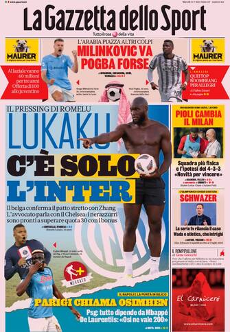 La Gazzetta dello Sport: apertura con titolo "Lukaku, c'è solo l'Inter". Il belga conferma il patto stretto con Zhang. L'avvocato parla con il Chelsea: i nerazzurri sono pronti a superare quota 30 milioni con i bonus