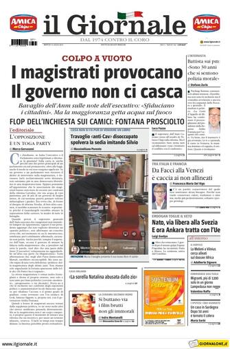 Il Giornale: apertura con titolo "I magistrati provocano. Il governo non ci casca". Bavaglio dell'Anm sulle note dell'esecutivo: "Sfiduciano i cittadini". Ma la maggioranza getta acqua sul fuoco