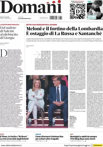 Domani: apertura con titolo "Meloni e il fortino della Lombardia. E' ostaggio di La Russa e Santanché". Legati indissolubilmente, il presidente del Senato e la ministra sono il duo egemone del potere Fdi in regione