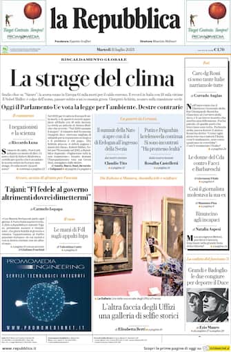 La Repubblica: apertura con titolo "La strage del clima". Studio choc su Nature: la scorsa estate in Europa 61mila morti per il caldo estremo. Il record in Italia con 18mila vittime