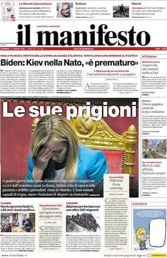 Il Manifesto: apertura con titolo "Le sue prigioni". A quattro giorni dalla velina di Palazzo Chigi contro i magistrati e a tre dall'ennesimo caso La Russa, Meloni evita di esporsi sulla giustizia e dribbla i giornalisti: "Sono in ritardo"