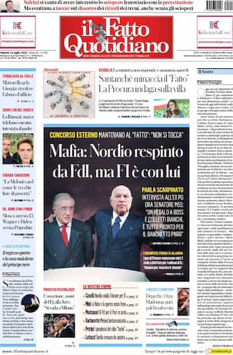 Il Fatto Quotidiano: apertura con titolo "Mafia, Nordio respinto da FdI, ma FI è con lui". Concorso esterno, Mantovano al Fatto: "Non si tocca"
