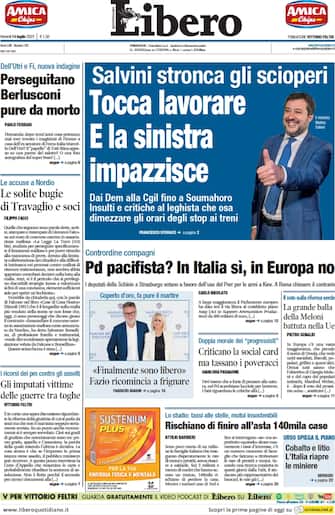 Libero: apertura con titolo "Salvini stronca gli scioperi: tocca lavorare e la sinistra impazzisce". Dai Dem alla Cgil fino a Soumahoro. Insulti e critiche al leghista che osa dimezzare gli orari degli stop ai treni