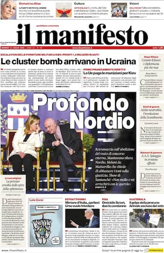 Il Manifesto: apertura con titolo "Profondo Nordio". Retromarcia sull'abolizione del reato di concorso esterno. Mantovano silura Nordio. Meloni da Mattarella che chiede di abbassare i toni sulla giustizia. Show di Santanché: "Non mollo e mi arricchirò con le querele"
