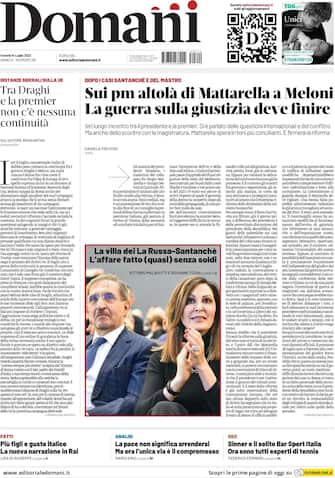 Domani: apertura con titolo "Sui pm altolà di Mattarella a Meloni. La guerra sulla giustizia deve finire". Ieri lungo incontro tra il presidente e la premier. Si è partito dalle questioni internazionali e dal conflitto. Ma anche dallo sconto con la magistratura. Mattarella spera in toni più concilianti. E firmerà la riforma