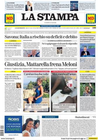 La Stampa: apertura con titolo "Giustizia, Mattarella frena Meloni". Di Matteo: "Vogliono rifare il piano Gelli". Videomessaggio della premier a Vox: Spagna, arrivano i patrioti"