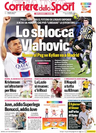 Corriere dello Sport: apertura con titolo "Lo sblocca Vlahovic". Folle giro: ora il futuro di Lukaku dipende anche da Mbappé, che può liberare lo juventino. Dusan al Psg se Kylian va a Madrid