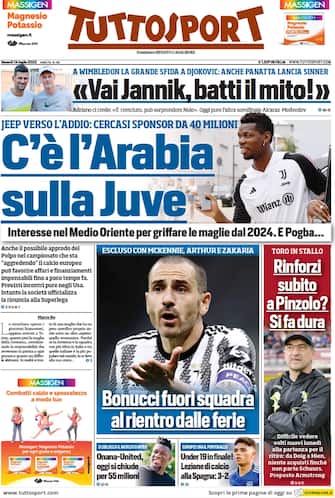 Tuttosport: apertura con titolo "C'è l'Arabia sulla Juve". Interesse nel Medio Oriente per griffare le maglie dal 2024. Spazio a "Bonucci fuori squadra al rientro dalle ferie"