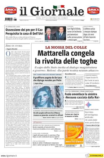 Il Giornale: apertura con titolo "Mattarella congela la rivolta delle toghe". Il capo dello Stato invita al dialogo magistratura e governo. Meloni: "Da parte nostra nessun attacco"