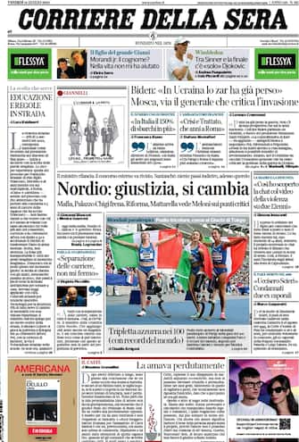 Corriere della Sera: apertura con titolo "Nordio: giustizia, si cambia". Mafia, Palazzo Chigi frena. Riforma, Mattarella vede Meloni sui punti critici