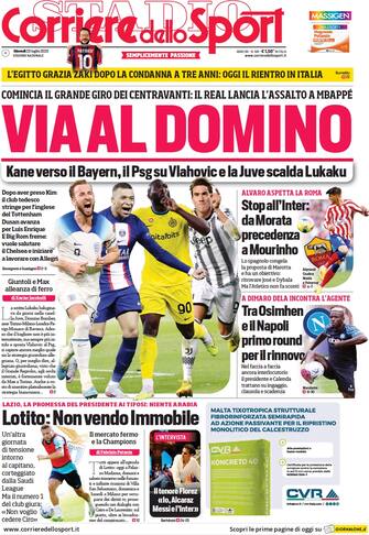 Corriere dello Sport: apertura con titolo "Via al domino". Kane verso il Bayern, il Psg su Vlahovic e la Juve scalda Lukaku
