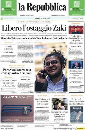La Repubblica: apertura con titolo "Libero l'ostaggio Zaki". Dopo la condanna, il presidente Al Sisi concede la grazia. Dietro la liberazione le garanzie di aiuti alimentari al Cairo