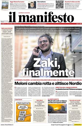 Il Manifesto: apertura con titolo "Zaki, finalmente". Un giorno dopo la condanna a tre anni, il leader egiziano Al-Sisi firma la grazia per Patrick Zaki e un pugno di detenuti politici, elargendo ciò che aveva fatto negare dai suoi tribunali