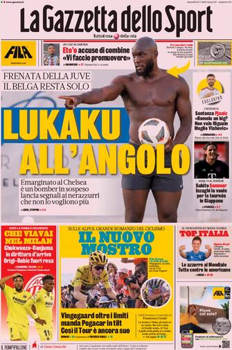 La Gazzetta dello Sport: apertura con titolo "Lukaku all'angolo". Frenata della Juve, il belga resta solo. Spazio a "Eto'o, accuse di combine: vi faccio promuovere"