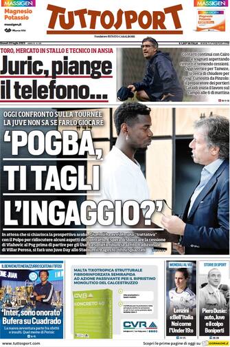 Tuttosport: apertura con titolo "Pogba, ti tagli l'ingaggio?" Oggi confronto sulla tournée. La Juve non sa se farlo giocare